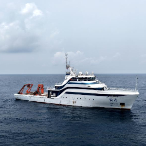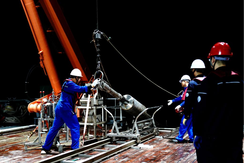 正在执行南海春季航次任务的“同济”号,于4月20日凌晨抵达目标海域第一个站位。漆黑的海面上,“同济”号船艉甲板灯火通明,来自同济大学、中国科学技术大学等单位的30名考察队员,开展了多波束与浅地层剖面探测、海水与沉积物孔隙水采集、重力柱状岩芯采集等科考作业。20日深夜,考察队员们又马不停蹄开展了下一个站位作业。