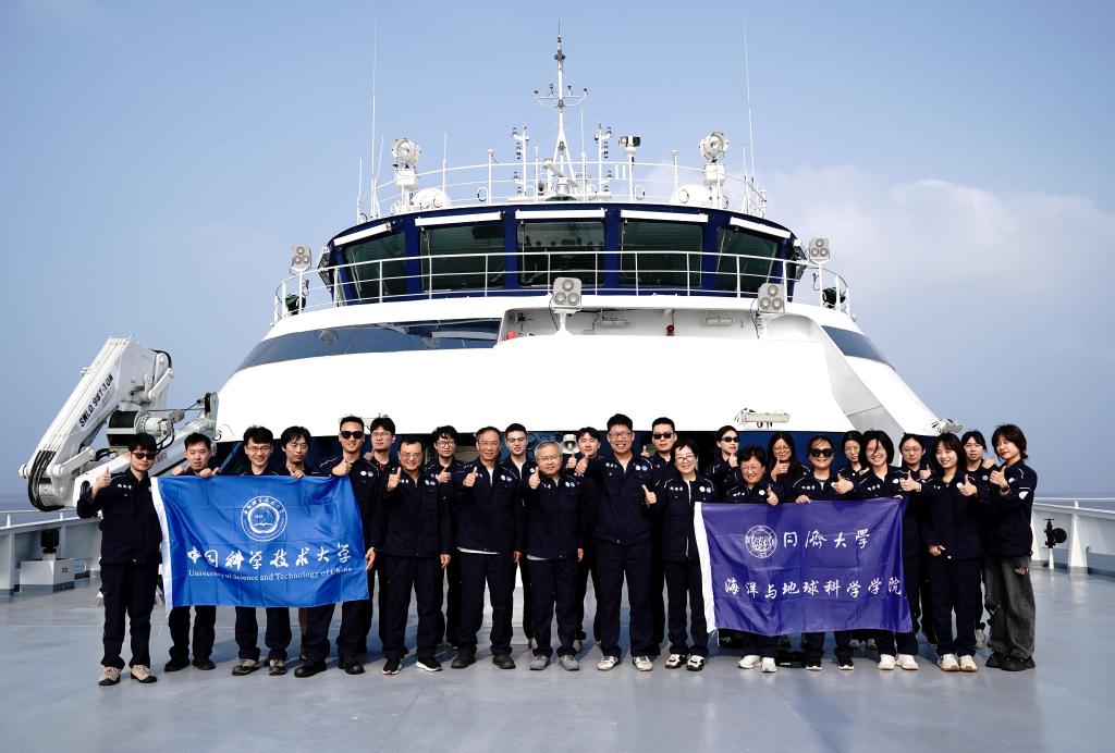 4月19日,来自同济大学和中国科学技术大学的考察队员在“同济”号合影。新华社记者张建松 摄