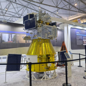 成都世纪城新国际会展中心展出的嫦娥六号四器组合体模型。新华社记者 李倩薇 摄