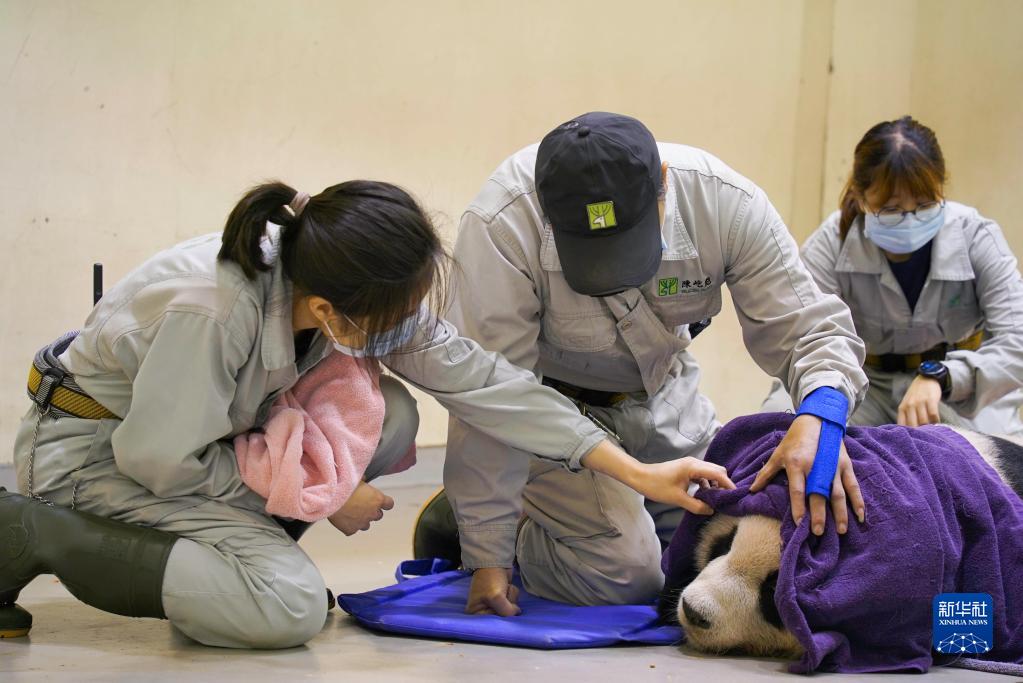 2022年11月19日,台北动物园工作人员在照顾病中的大陆赠台大熊猫“团团”。新华社发