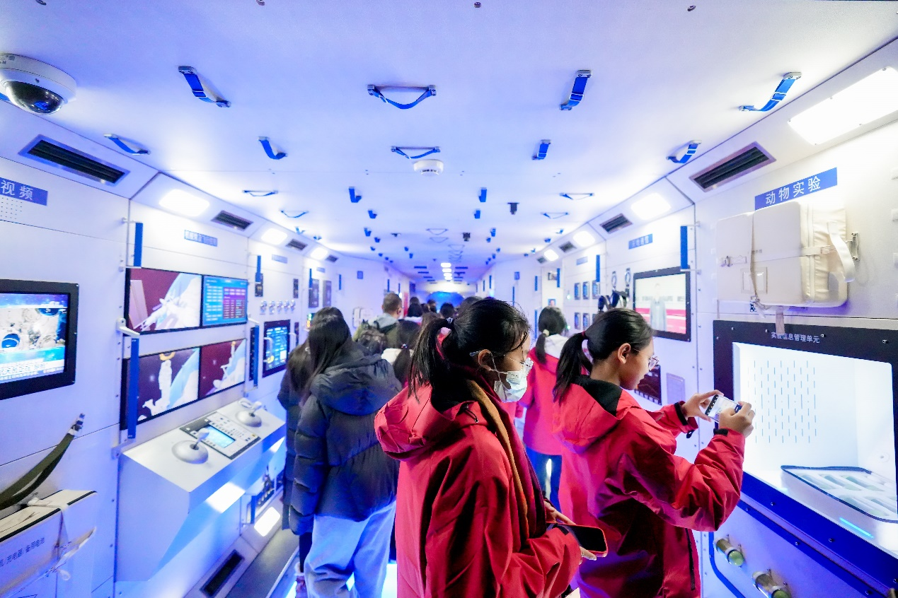 展区陈列的火星车、空间站等人类探索宇宙的辉煌成就让女孩们叹为观止。女孩们还近距离观赏1:1还原的天宫一号核心舱,模拟体验航天员在太空中的日常生活,沉浸式感受遨游星辰大海的奇妙之旅。