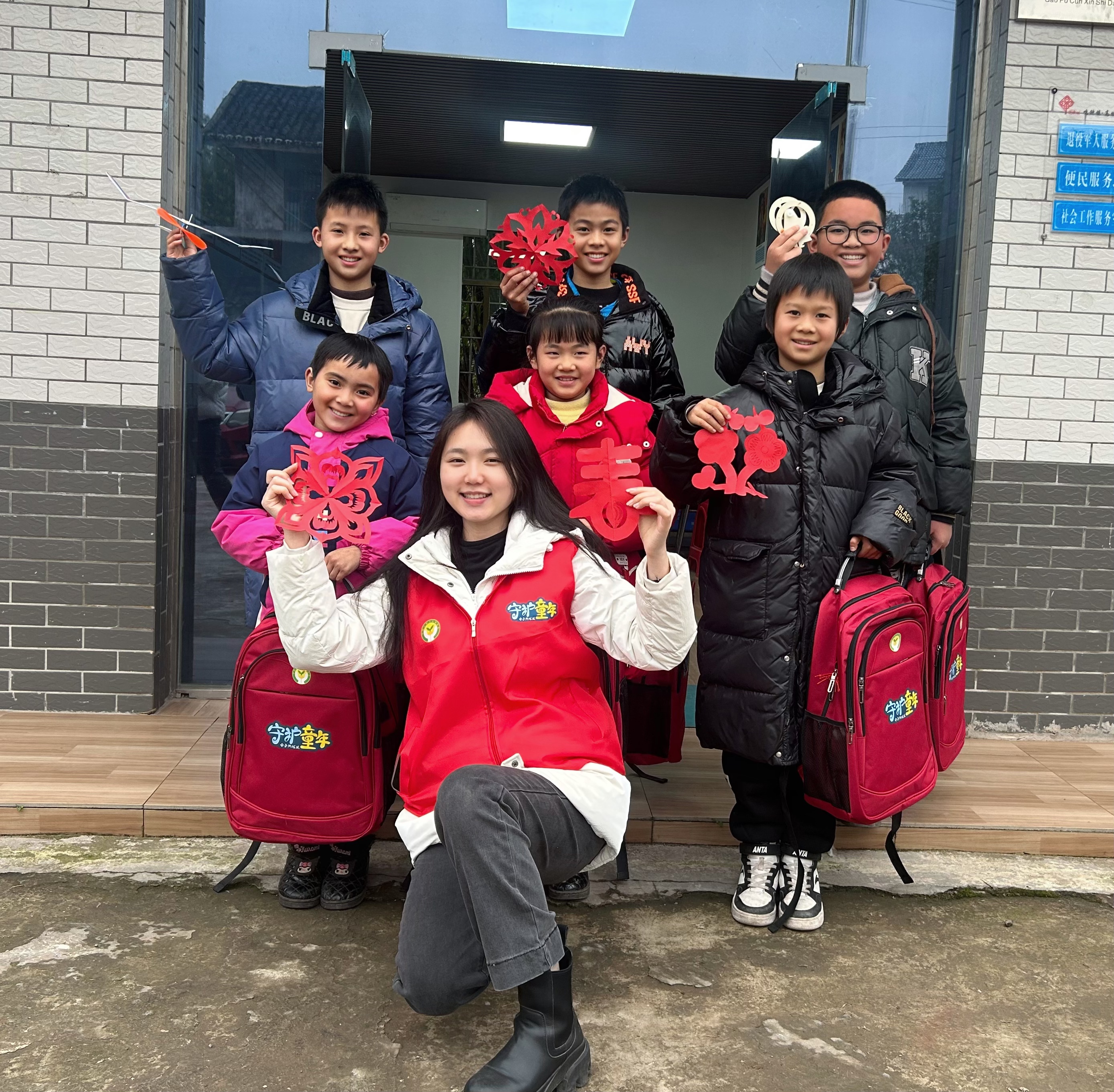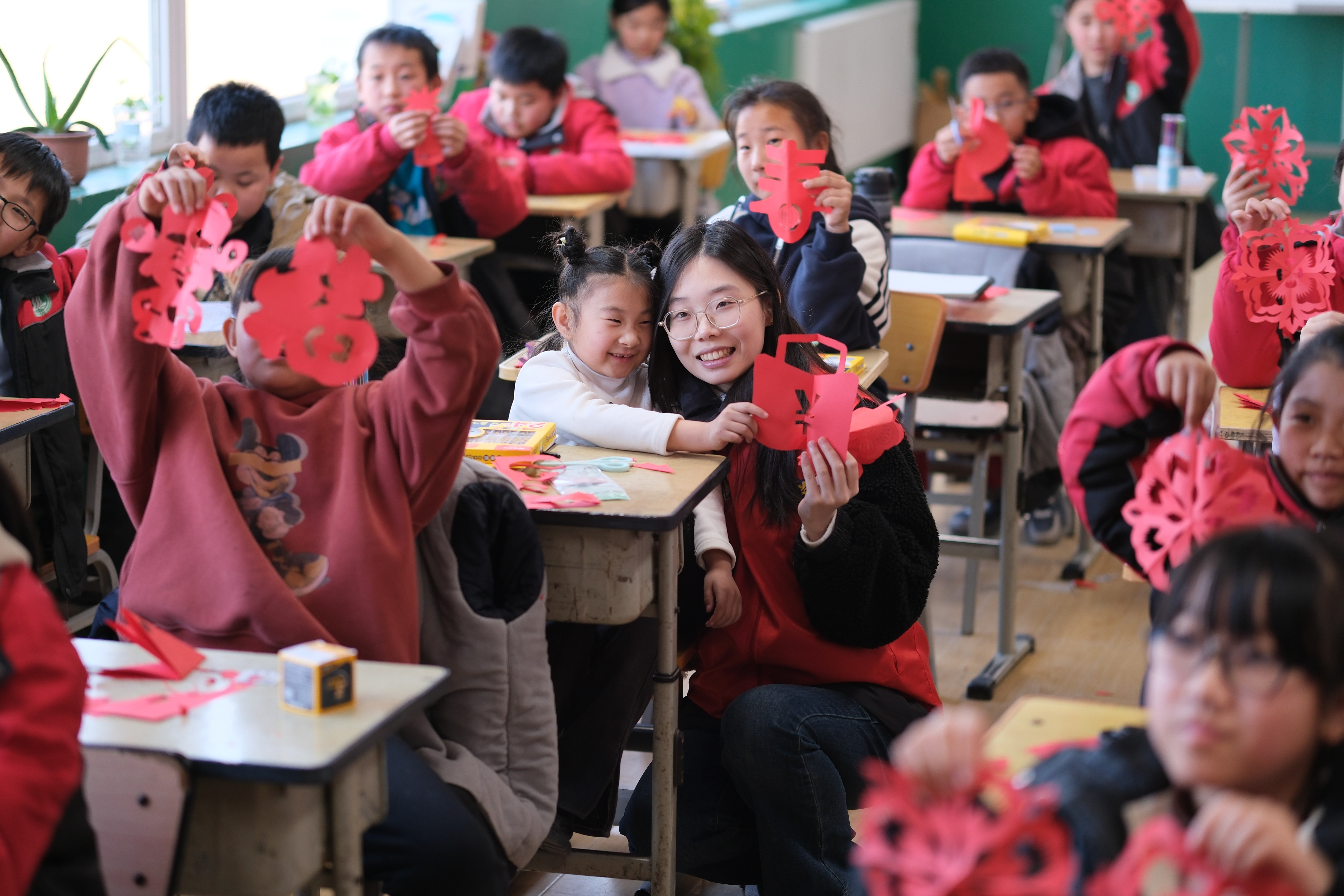 1月17日至18日,四川省广安市武胜县鸣钟镇高坡村,西南科技大学志愿者易昕昕回到家乡,带领同乡儿童制作形式多样的剪纸。