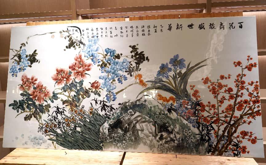 图为徐亚凤、宁勤征等13余位国家级工艺美术大师联袂创作的“百花齐放·盛世新华”主题陶瓷艺术作品(新华网高民辉、章佳礼摄)