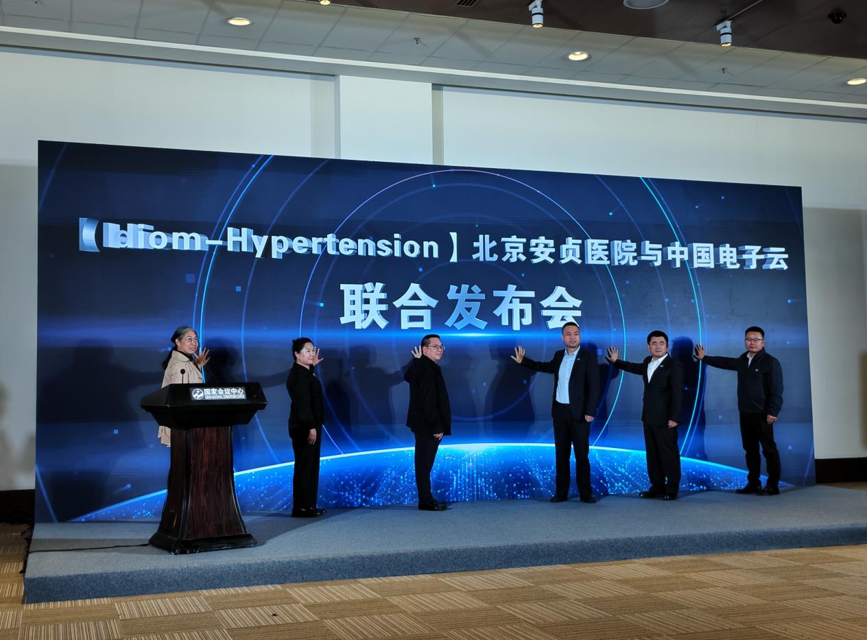 图注:北京安贞医院院长蔡军、高血压中心主任程文立、高血压中心二区副主任医师王宁,中国电子云高级副总裁黄锋、副总裁杜剑、卫健行业线副总经理徐承龙共同发布