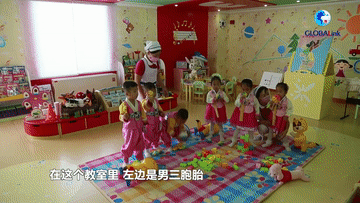 活动室内,穿着朝鲜传统服装的三胞胎幼儿热情地向记者打招呼。