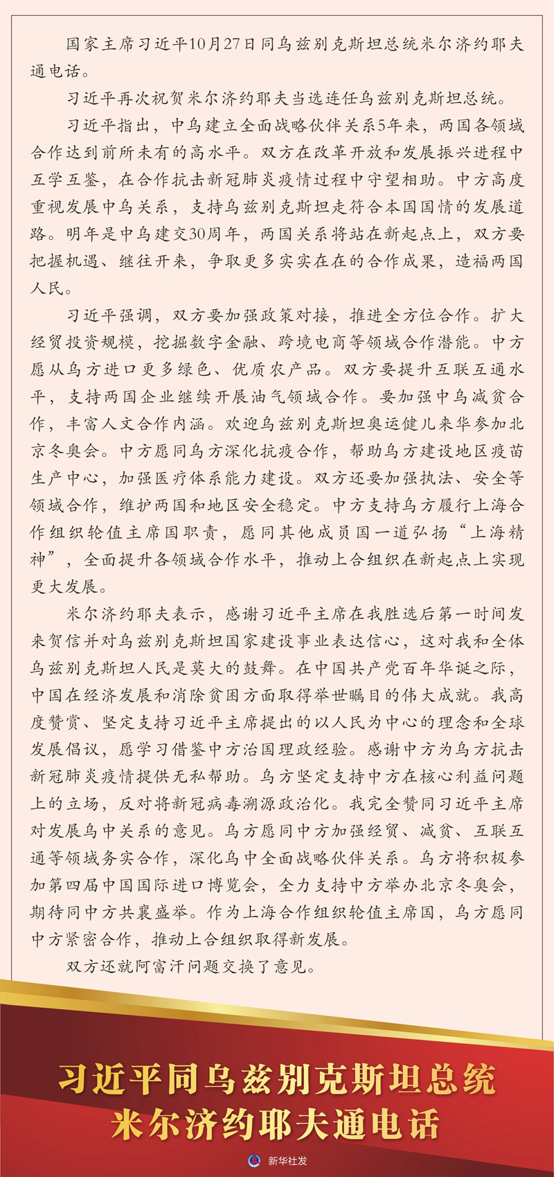 米尔济约耶夫表示,感谢习近平主席在我胜选后第一时间发来贺信并对乌兹别克斯坦国家建设事业表达信心,这对我和全体乌兹别克斯坦人民是莫大的鼓舞。在中国共产党百年华诞之际,中国在经济发展和消除贫困方面取得举世瞩目的伟大成就。我高度赞赏、坚定支持习近平主席提出的以人民为中心的理念和全球发展倡议,愿学习借鉴中方治国理政经验。感谢中方为乌方抗击新冠肺炎疫情提供无私帮助。乌方坚定支持中方在核心利益问题上的立场,反对将新冠病毒溯源政治化。我完全赞同习近平主席对发展乌中关系的意见。乌方愿同中方加强经贸、减贫、互联互通等领域务实合作,深化乌中全面战略伙伴关系。乌方将积极参加第四届中国国际进口博览会,全力支持中方举办北京冬奥会,期待同中方共襄盛举。作为上海合作组织轮值主席国,乌方愿同中方紧密合作,推动上合组织取得新发展。