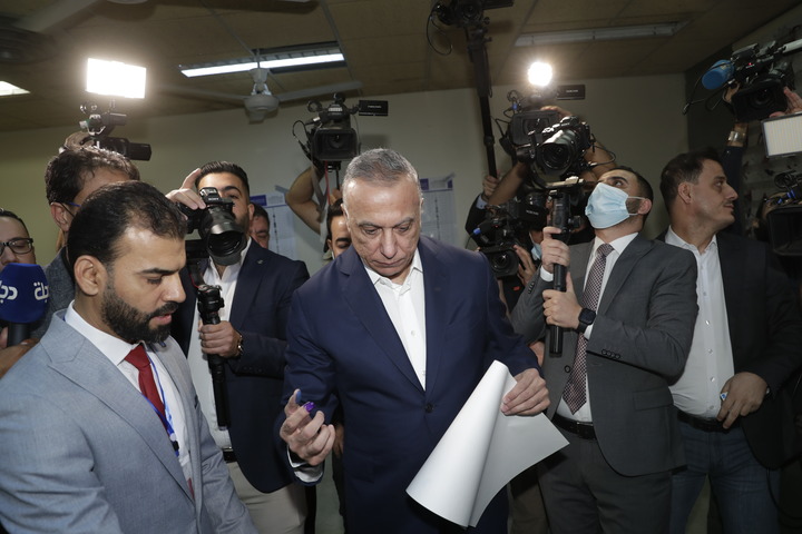 10月10日,伊拉克总理卡迪米(中)在巴格达参加新一届国民议会选举投票。新华社发