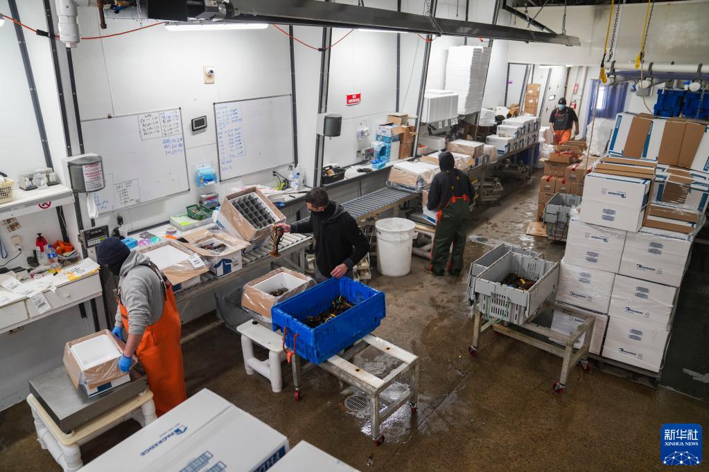 1月24日,在美国缅因州阿伦德尔镇的“龙虾公司”,工人将准备发货的龙虾装箱。