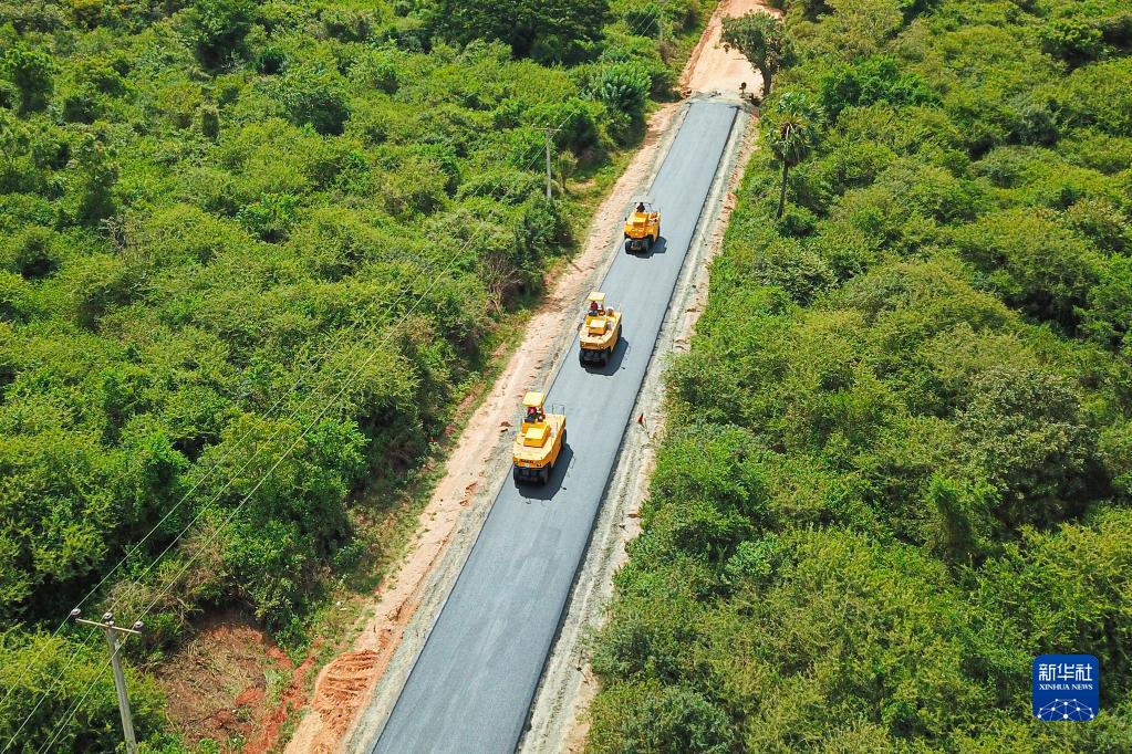 这是2021年6月12日拍摄的斯里兰卡瓦武尼亚地区乡村道路改造工程施工现场(无人机照片)。