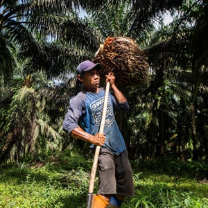 4月26日,在印度尼西亚茂物一处油棕种植园,一名工人准备将收获的棕榈果装运到卡车上。新华社发(维里 摄)