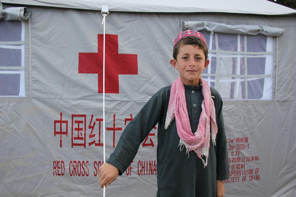 7月18日,在阿富汗地震重灾区帕克提卡省齐鲁克区,一名男孩站在中国红十字会援助的救灾帐篷外。新华社发(萨巴文摄)