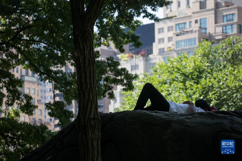 7月24日,在美国纽约,一名男子在树荫下休息。