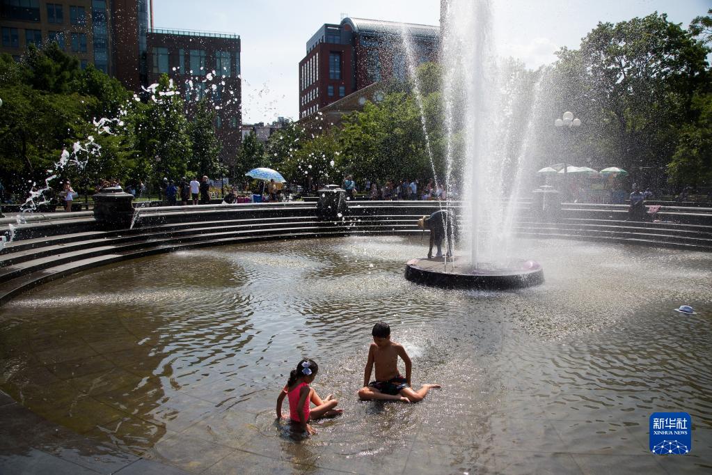 7月24日,在美国纽约,儿童在喷泉中戏水纳凉。