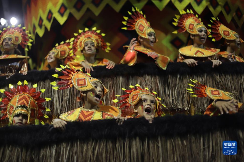 2月18日凌晨,在巴西圣保罗市阿年比桑巴大道,舞者参加狂欢节表演。