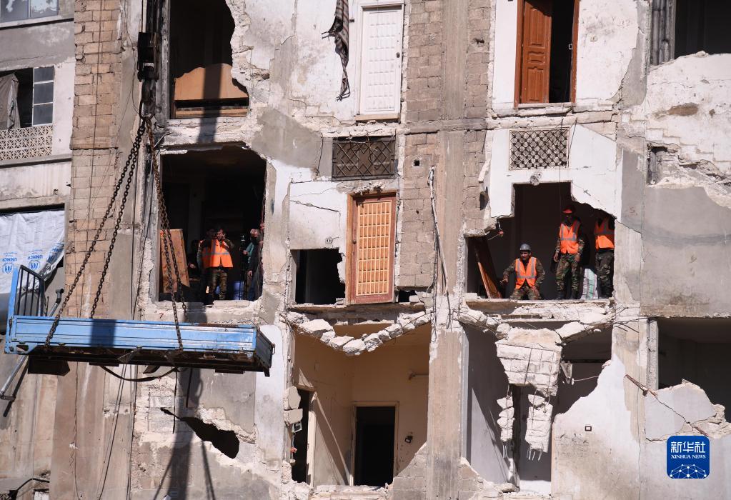 2月18日,在叙利亚哈马省,人们从地震受损建筑中转移家具和物品。