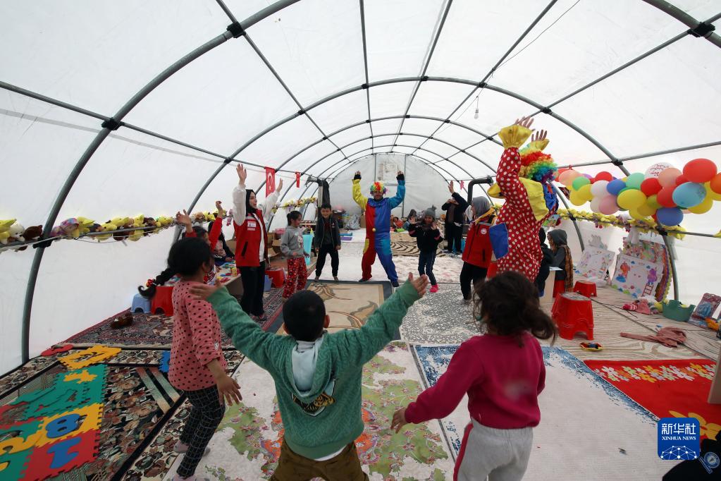 2月19日,在土耳其南部卡赫拉曼马拉什省卡赫拉曼马拉什市,孩子们在居民安置点做游戏。