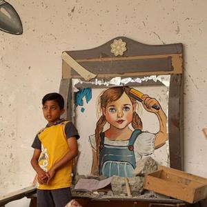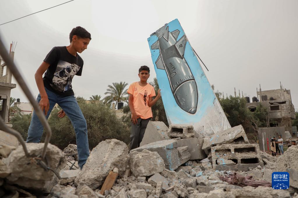 6月8日,儿童在加沙地带中部一处难民营附近画有涂鸦的废墟玩耍。