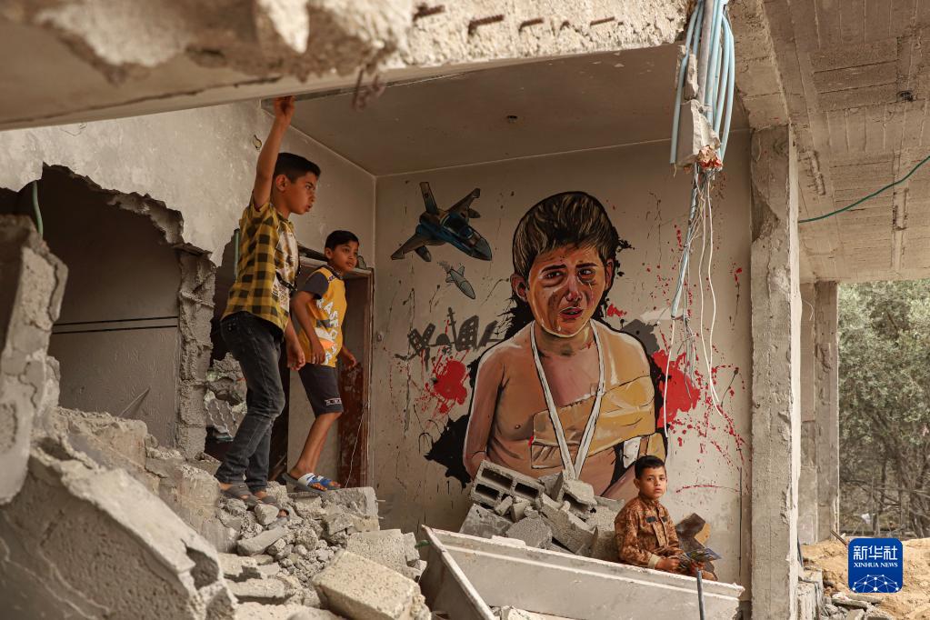 6月8日,儿童在加沙地带中部一处难民营附近画有涂鸦的废墟玩耍。