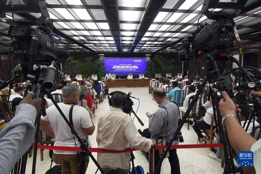 这是6月9日在古巴首都哈瓦那拍摄的哥伦比亚政府与反政府武装“哥伦比亚民族解放军”第三轮和谈闭幕式现场。