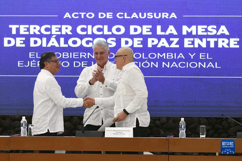 6月9日,在古巴首都哈瓦那,哥伦比亚总统佩特罗(左)与“哥伦比亚民族解放军”第一指挥官安东尼奥·加西亚(右)在和谈闭幕式上握手,古巴国家主席迪亚斯-卡内尔鼓掌。