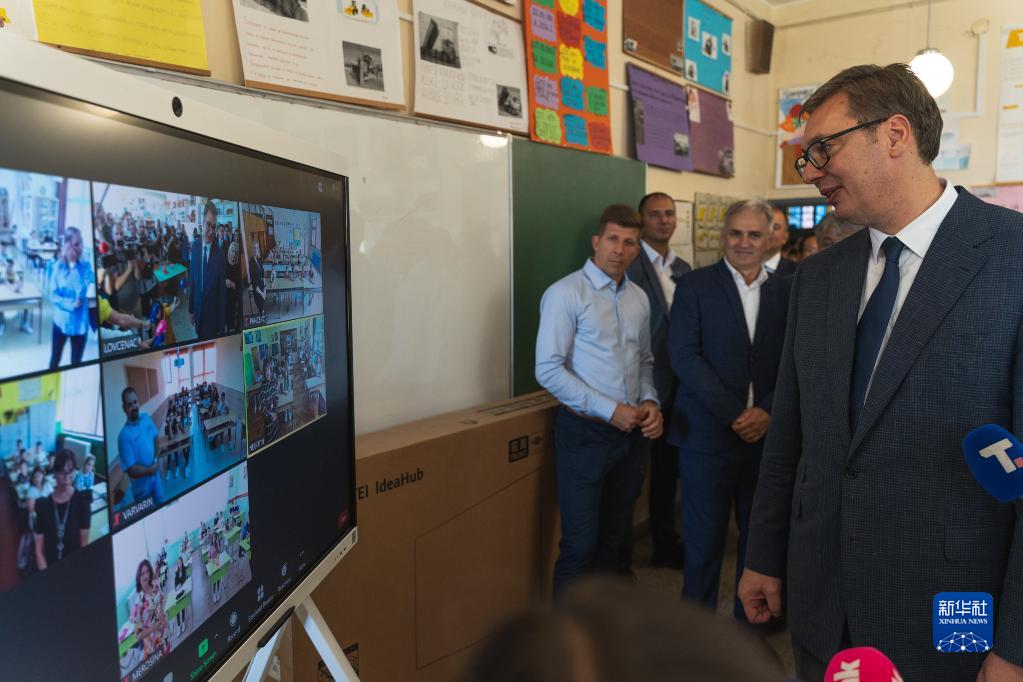 9月1日,在塞尔维亚北部伏伊伏丁那省的一所小学,塞尔维亚总统武契奇(右一)使用华为智慧屏通过视频连线向塞尔维亚多所小学的学生致以开学问候。