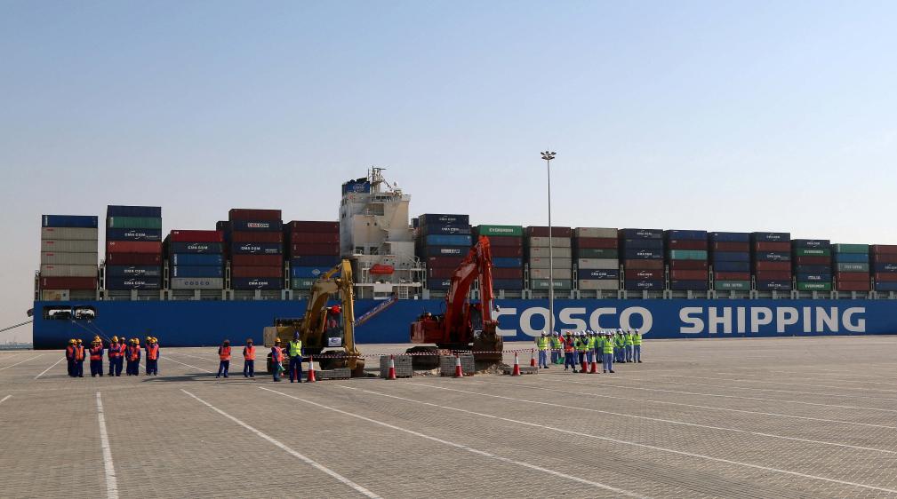 2017年11月5日,在阿拉伯联合酋长国阿布扎比,中远海运港口有限公司举行中远海运港口阿布扎比码头正式动工暨场站租赁签约仪式,标志着中国和阿联酋“一带一路”项目建设取得新进展。新华社记者苏小坡摄