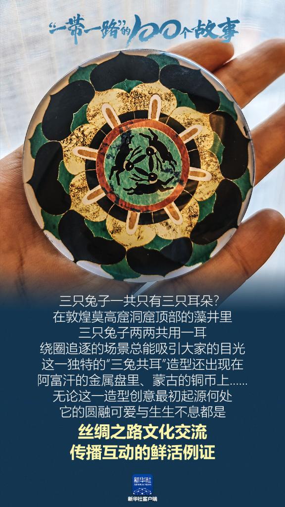三只兔子一共只有三只耳朵?在敦煌莫高窟洞窟顶部的藻井里,三只兔子两两共用一耳、绕圈追逐的场景总能吸引大家的目光。这一独特的“三兔共耳”造型还出现在阿富汗的金属盘里、蒙古的铜币上......无论这一造型创意最初起源何处,它的圆融可爱与生生不息都是丝绸之路文化交流、传播互动的鲜活例证。(记者:吴丹妮)