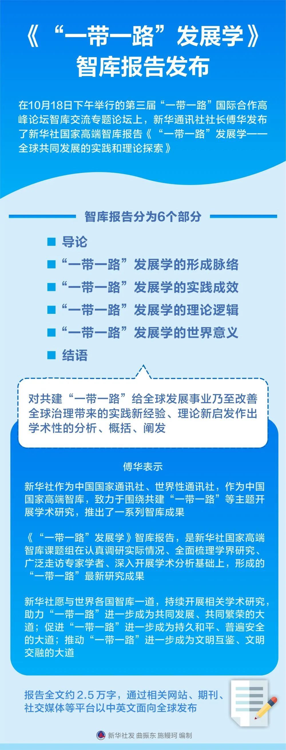 ◆ 在10月18日下午举行的第三届“一带一路”国际合作高峰论坛智库交流专题论坛上,新华通讯社社长傅华发布了新华社国家高端智库报告《“一带一路”发展学——全球共同发展的实践和理论探索》。