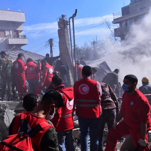 1月20日,叙利亚首都大马士革西部迈宰地区一栋多层住宅楼遭袭,救援人员来到现场救援。新华社发(阿马尔·萨法尔贾拉尼摄)