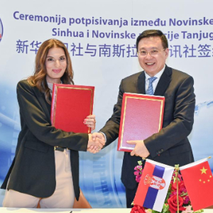 4月30日,新华通讯社社长、新华社国家高端智库学术委员会主任傅华出席在贝尔格莱德举行的中塞媒体智库研讨会暨《构建人类命运共同体的时代价值和实践成就》(塞文版)智库报告发布仪式并发表主旨讲话。会后,新华社同南通社签署新闻交换协议,双方一致同意加强在新闻传播领域的交流与合作。这是傅华同塞尔维亚南斯拉夫通讯社社长格尔契奇在签约仪式上握手。