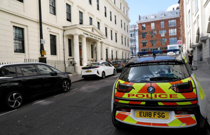 2022年8月8日,在英国伦敦,一辆警车停在警察局门口。新华社记者李颖摄
