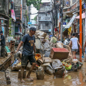 7月25日,居民在菲律宾马里基纳市清理遭洪水侵袭的街道。