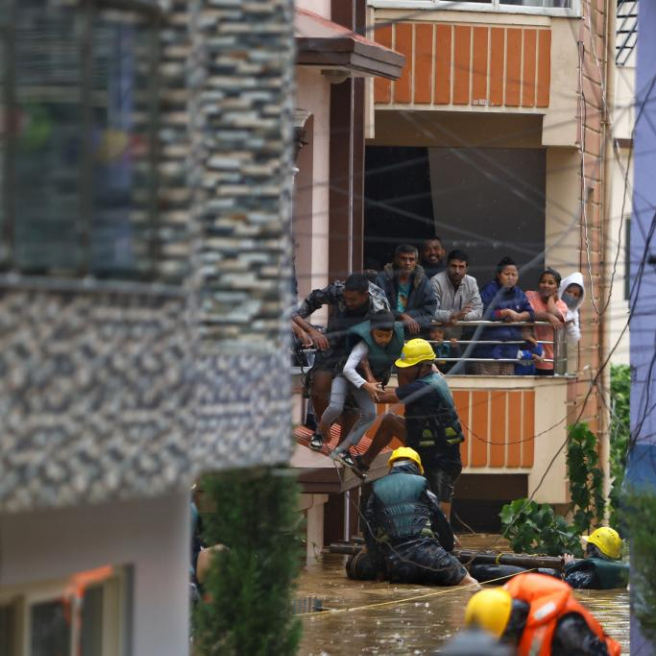 9月28日,在尼泊尔勒利德布尔,救援人员营救受困人员。新华社发(苏拉韦·什雷斯塔摄)