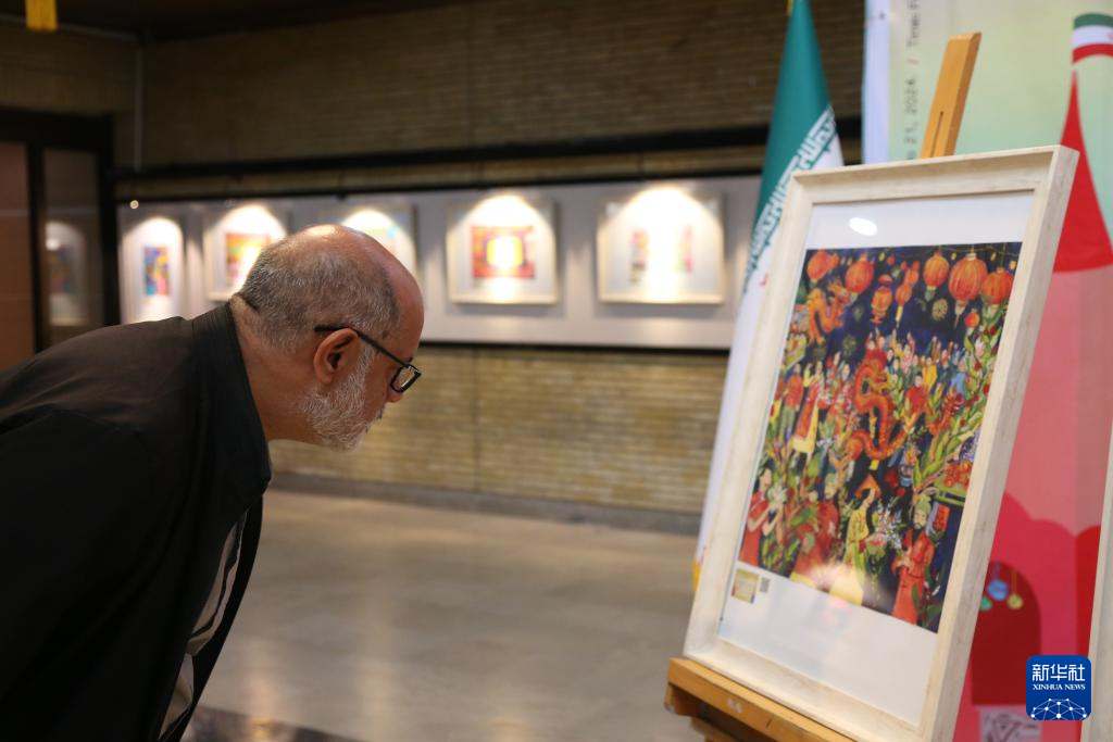 10月8日,在伊朗首都德黑兰,观众欣赏绘画比赛获奖作品。