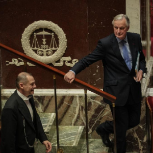 12月4日,在法国巴黎,法国总理巴尼耶(中)在国民议会就对政府不信任动议投票表决前辩论上发言后离开。