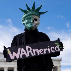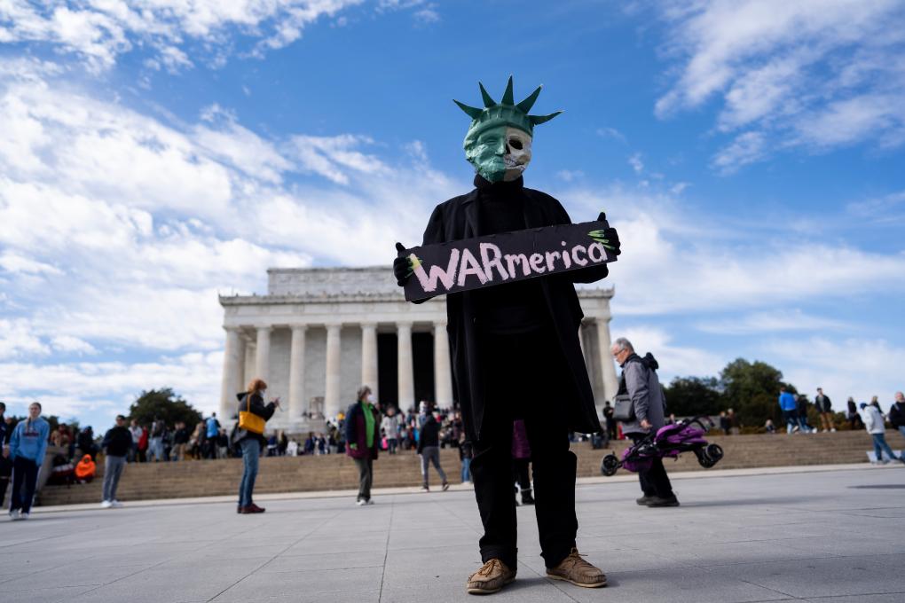 2023年2月19日,在美国首都华盛顿,一名抗议者手举标语在林肯纪念堂前参加集会。组织者说,这可能是伊拉克战争以来美国最大反战示威,抗议者要求美国停止煽动俄乌冲突、促进双方和谈、解散北大西洋公约组织(北约)、削减美国军费等等。新华社记者刘杰摄