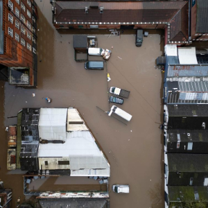 1月1日,在英国曼彻斯特,汽车停放在被洪水淹没的道路上(无人机拍摄)。