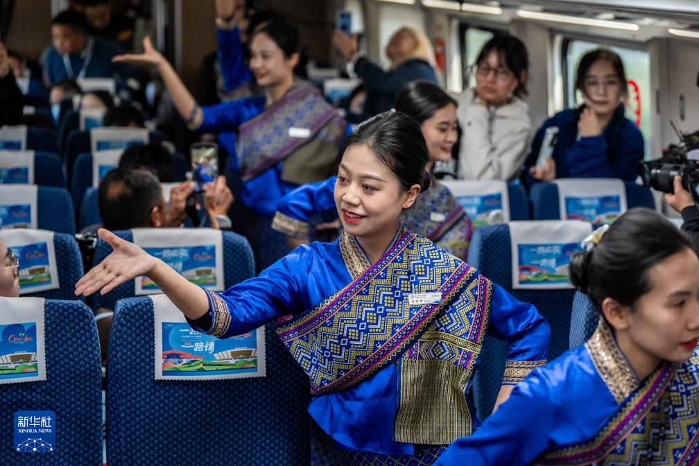 1月14日,中国铁路昆明局“金花列车员”在D87次中老铁路国际旅客列车上表演节目。新华社记者 胡超 摄