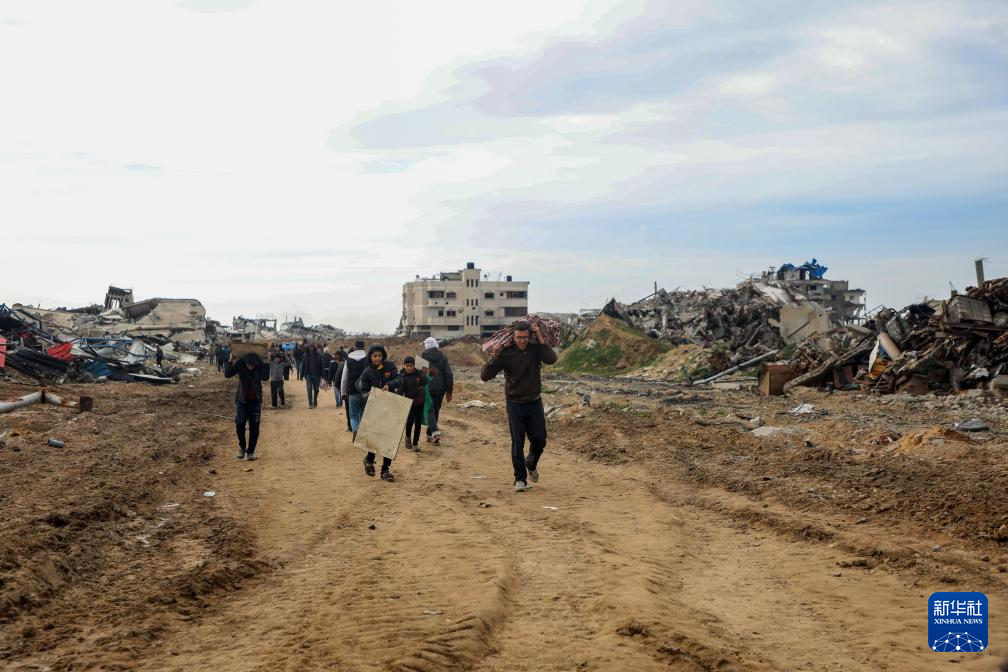 2月9日,在加沙地带内察里姆走廊附近,巴勒斯坦人从加沙地带南部返回北部的家园。新华社发(里泽克·阿卜杜勒贾瓦德摄)