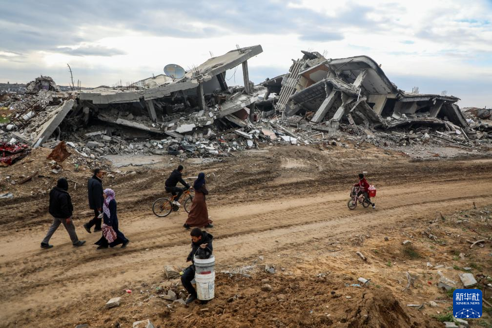 2月9日,在加沙地带内察里姆走廊附近,巴勒斯坦人经过建筑废墟。新华社发(里泽克·阿卜杜勒贾瓦德摄)