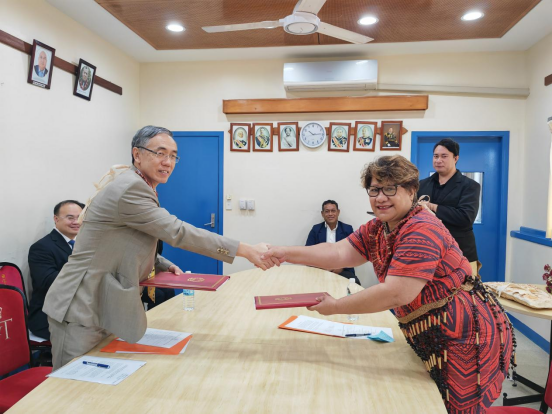 中国驻汤加大使刘为民和汤加卫生大臣阿卡乌奥拉签署交接证书。(中国医疗队供图)