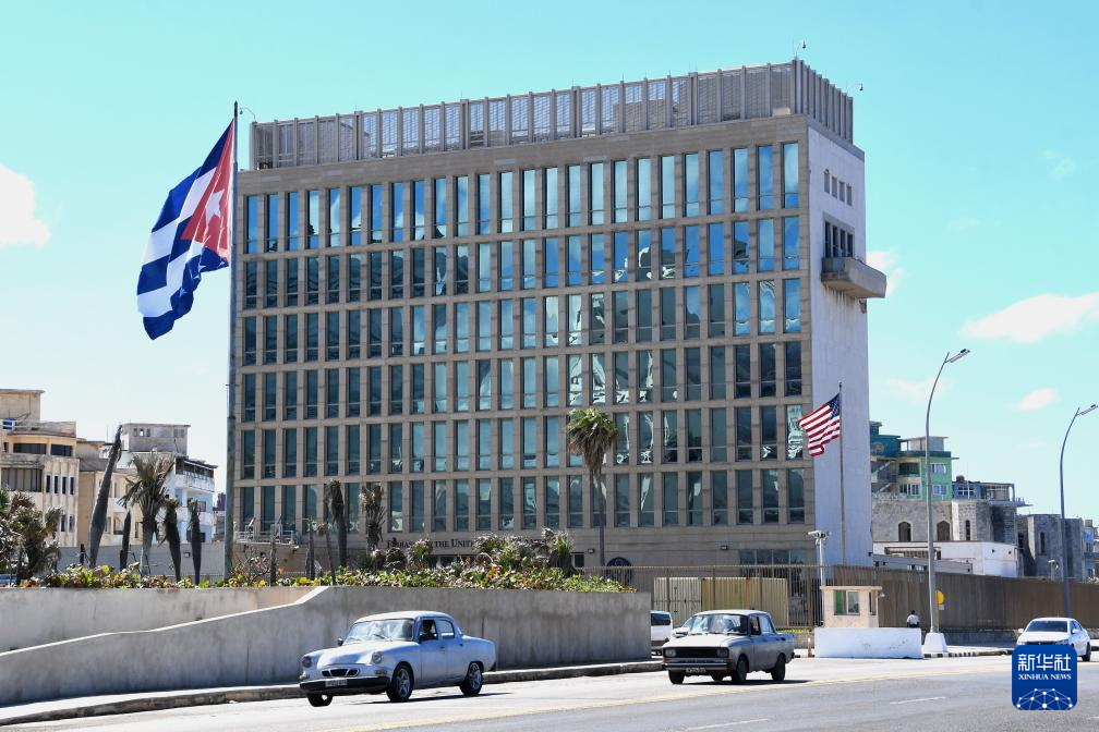 2月26日,在古巴首都哈瓦那,车辆驶过美国驻古巴大使馆。新华社发(华金·埃尔南德斯摄)