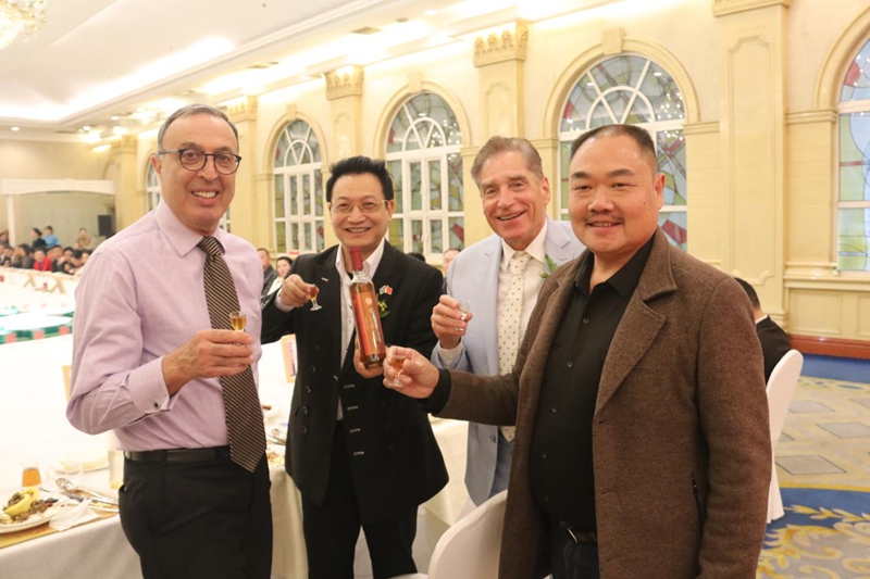 图为保加利亚前总统彼得·斯托扬诺夫(左一)、联合国艺术基金会主席车夫(左二)、罗马尼亚前总理彼得·罗曼(右二)、四川省彭州市明台村村干部谢贤斌(右一)一起品尝四川省彭州市明台村的乡村好物“茶仙酿”。