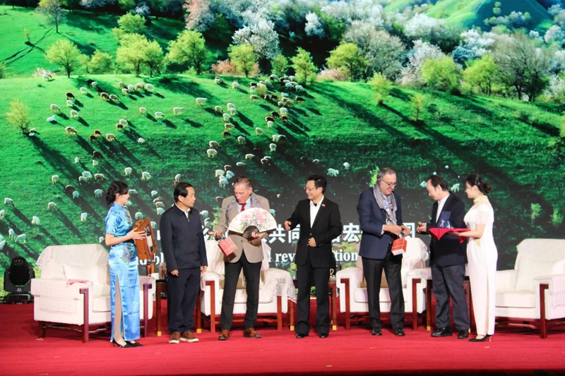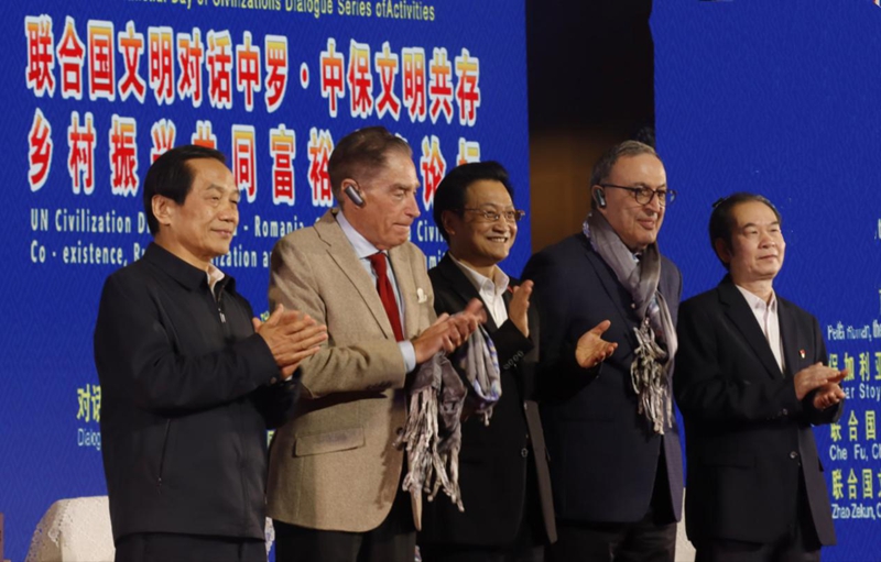图为联合国艺术基金会主席车夫(中间)、罗马尼亚前总理彼得·罗曼(左二)、保加利亚前总统彼得·斯托扬诺夫(右二)、原中国农业电影电视中心党委书记、主任,全国性行业协会商会第四联合党委书记赵泽琨(左一)、四川省东西方文化交流促进会会长唐新江(右一)参加联合国文明对话国际日系列活动“中罗·中保文明对话”活动。