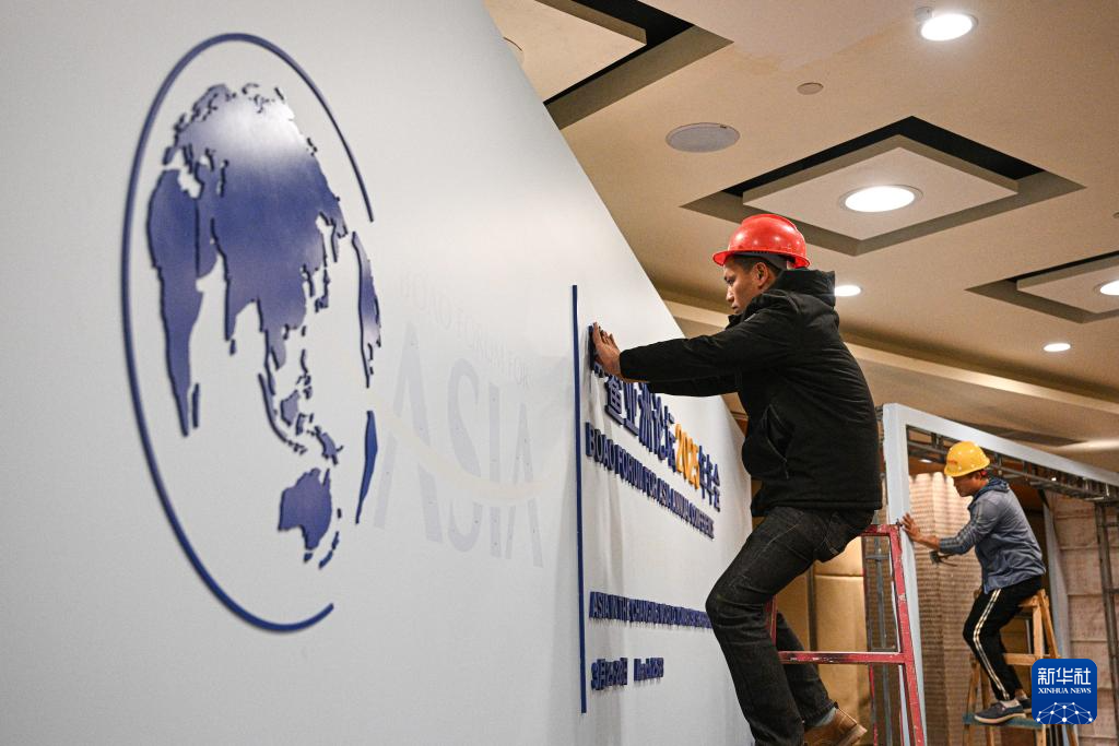 工作人员在布置博鳌亚洲论坛2025年年会分会场(3月19日摄)。
