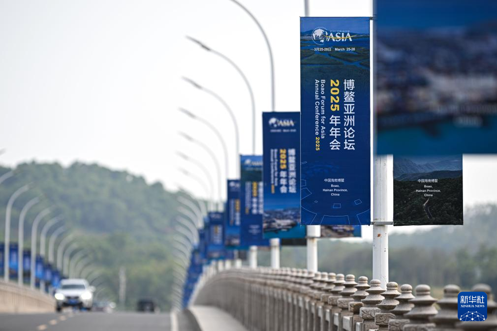 海南博鳌大乐大桥上的博鳌亚洲论坛2025年年会主题宣传牌(3月20日摄)。