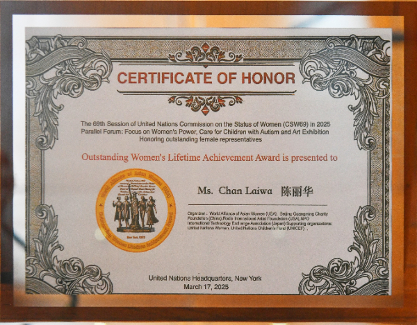 在颁奖典礼中,香港富华国际集团创办人、中国紫檀博物馆馆长陈丽华获得“杰出女性终身成就奖”,以表彰她在文化、艺术、慈善等领域做出的贡献。在同期举办的“爱与希望”艺术特展上,陈丽华获得“杰出艺术作品奖”。
