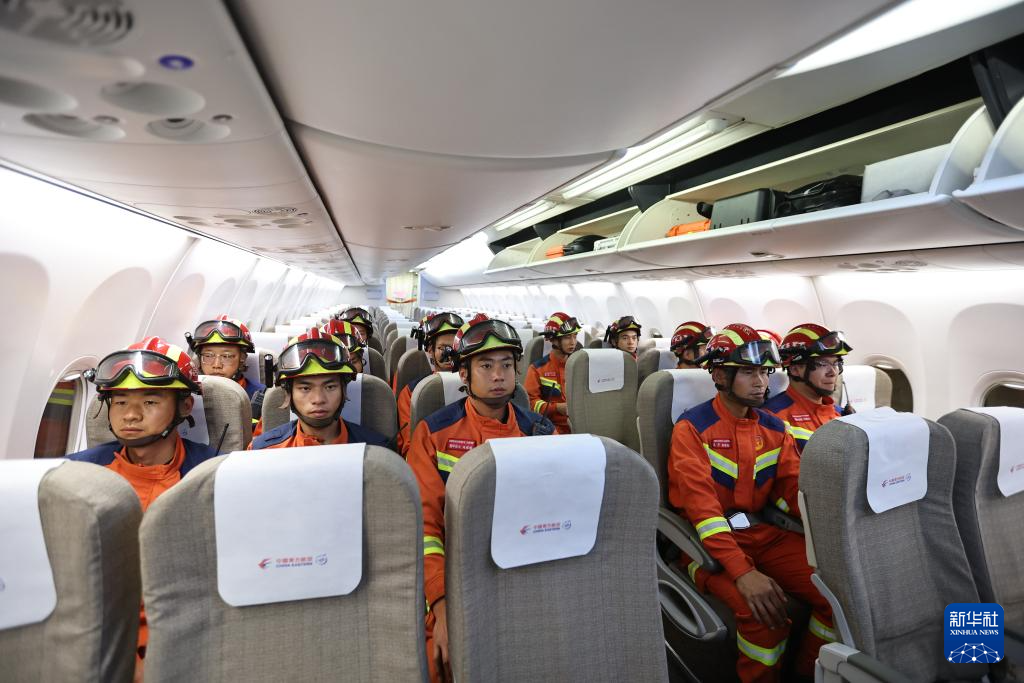 中国云南救援医疗队在前往缅甸的飞机上(3月29日摄)。新华社发(陈飞 摄)