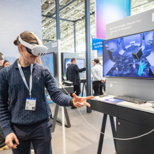2025年3月31日,在德国汉诺威工业博览会上,一名参观者通过VR设备在虚拟世界中抛掷物品。新华社记者张帆摄