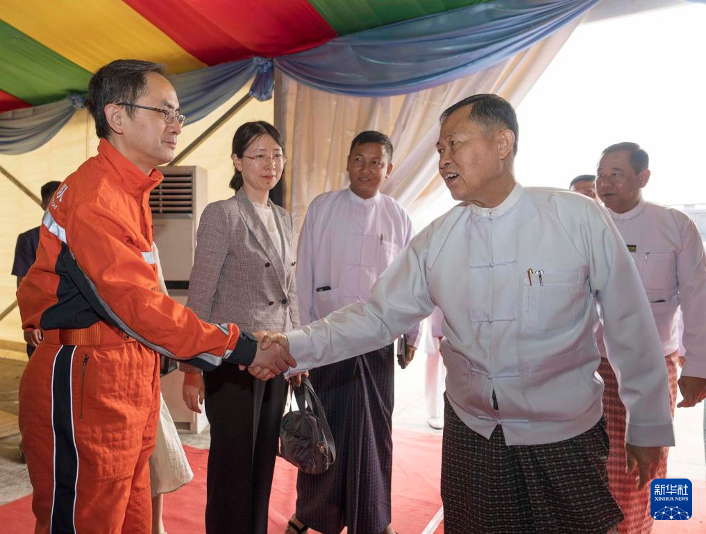 4月8日,在缅甸首都内比都,缅方在社会福利和救济安置部为中方救援队举办感谢仪式,缅甸国家管理委员会副主席梭温(前右一)与中国救援队队员握手。新华社记者 才扬 摄